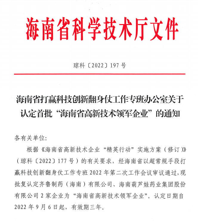 近日,海南省科学技术厅发布的《海南省打赢科技创新翻身仗工作专班办公室关于认定首批“海南省高新技术领军企业”的通知》中显示,批复认定海南尊龙官方网站药业集团股份有限公司等2家企业为“海南省高新技术领军企业”。认定日期自2022年9月6日起,有效期三年。